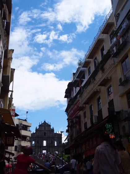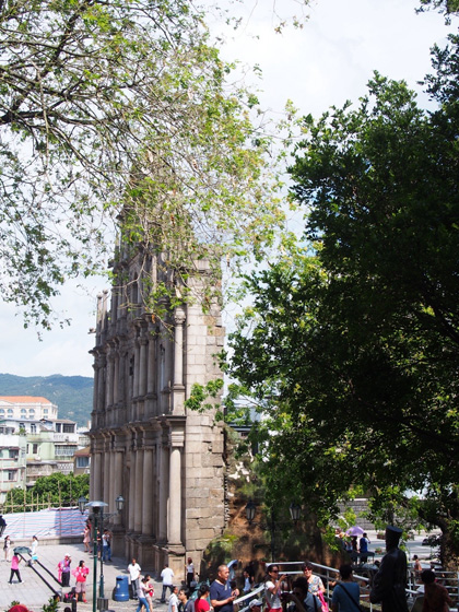 マカオのシンポルともいえる聖ポール天主堂跡。1602年から1640年にかけて建設され、完成当時は荘厳な姿で丘の上に建っていた教会でしたが、1835年の火災によって焼け落ちてしまったため、教会の正面の壁と68段の階段だけが残る現在の姿となりました。